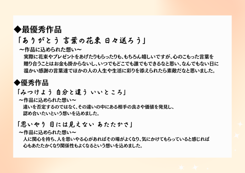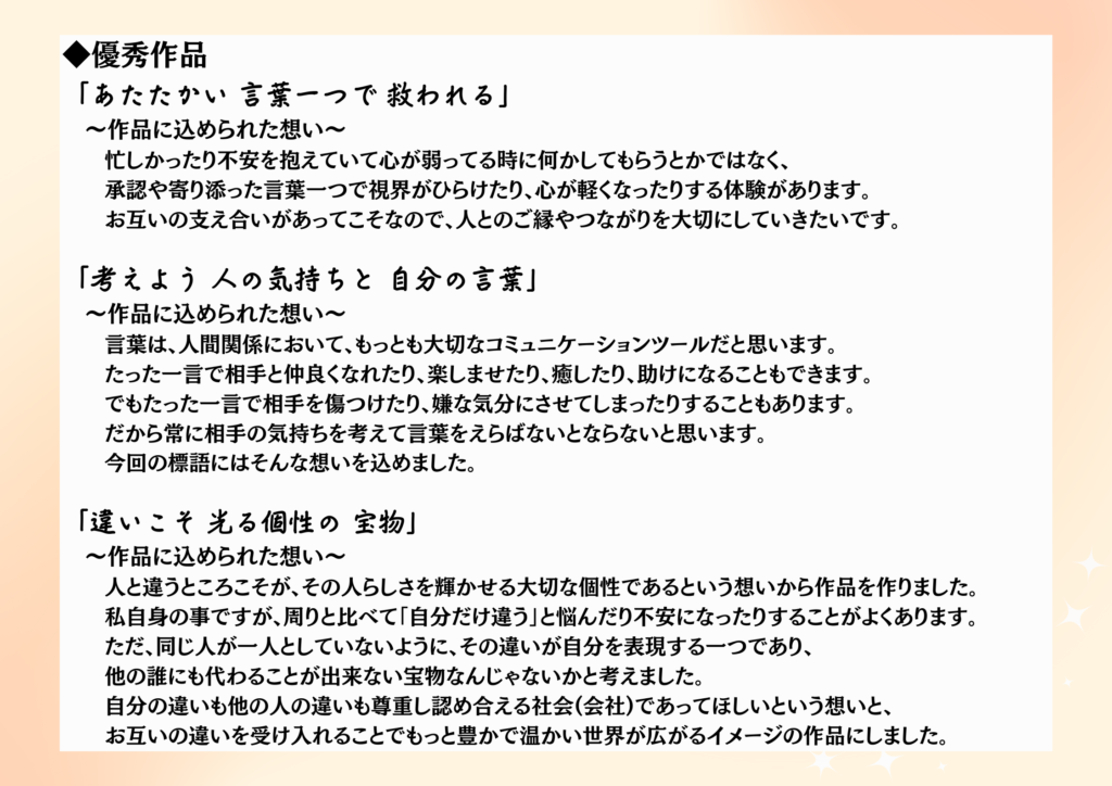 どの作品からも、「相手を想う優しさ」や「一人ひとりの違いを大切にする心」が溢れています。