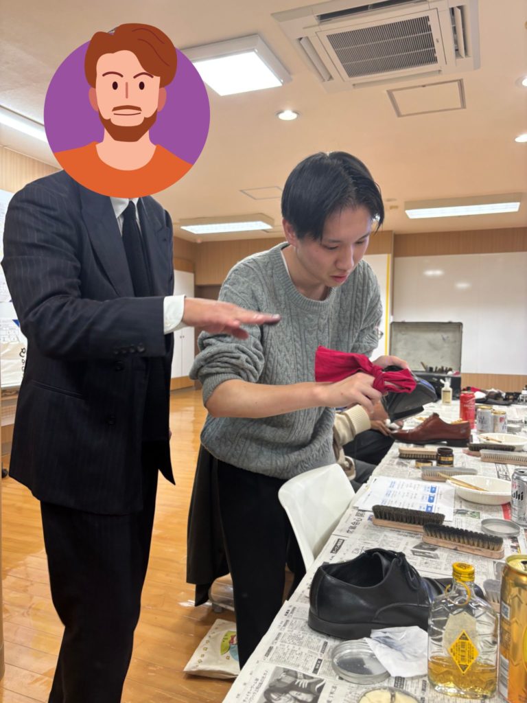 今回は、プロの靴磨き職人である、濱岡先生をお呼びして、初参加の方も交えて、靴磨きを行いました。