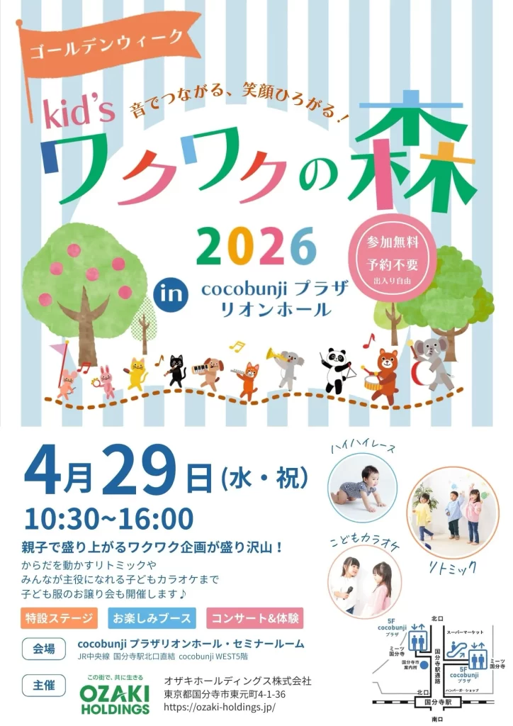 2026年4月29日(水) cocobunjiプラザリオンホールでの「Kid’s ワクワクの森」の開催が決定しました!